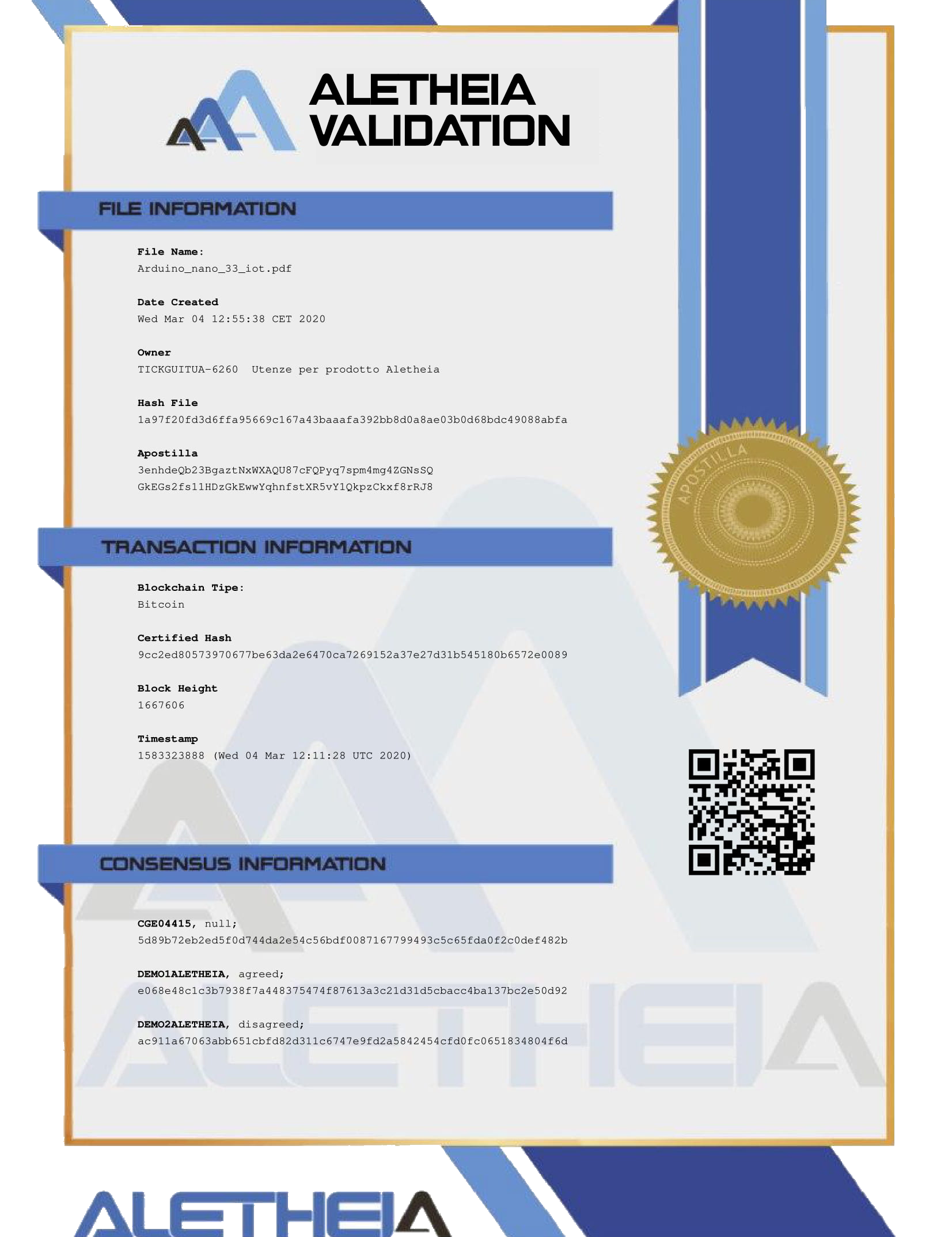 Apostilla: hash del file firmato con la chiave privata di Aletheia.